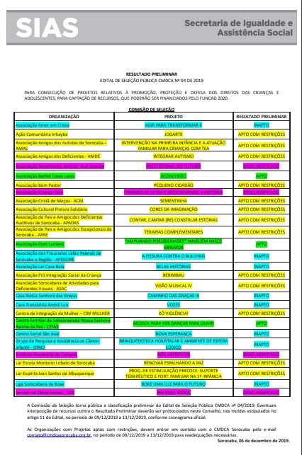 Resultado Preliminar – Edital 04 / Projetos 09/12/2019 Conselho: Conselho da Criança e Adolescente (CMDCA) Tipo: Publicação Numeração: Jornal do Município - 2399 - pág 54 e arquivo anexo Data do documento: 06/12/2019 Anexo: