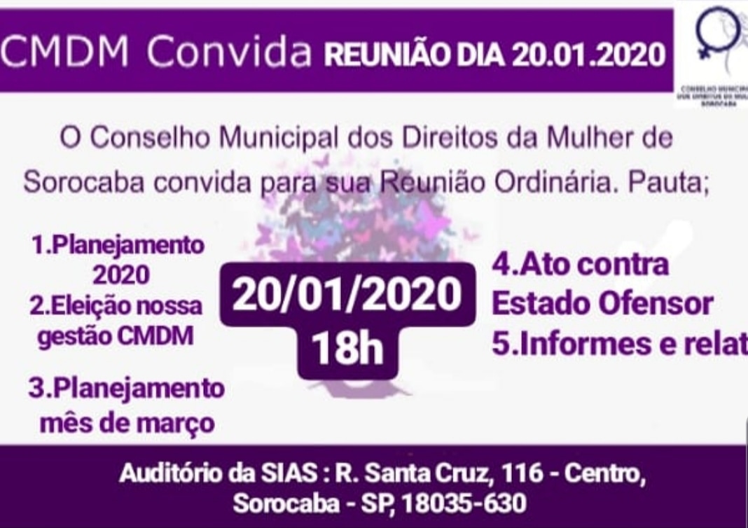 Reunião do Conselho Municipal dos Direitos da Mulher – 20 de janeiro de 2020 20/01/2020 Conselho: Conselho Municipal dos Direitos da Mulher (CMDM) Tipo: Pauta de reunião Numeração: JANEIRO 2020 Data do documento: 20/01/2020 Anexo: