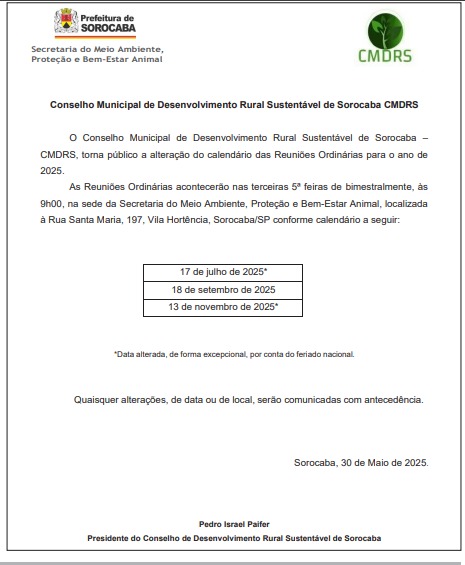 Alteração do calendário Anual das Reuniões Ordinárias – CMDRS – 2025 04/06/2025 Conselho: Conselho Municipal de Desenvolvimento Rural (CMDRS) Tipo: Planejamento e cronograma Numeração: Calendário das Reuniões Data do documento: 30/05/2025 Anexo:
