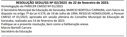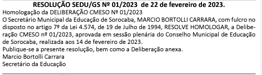 Homologação da Deliberação CMESO n.º 01/2023 – Fixa normas para apreciação, pelo Conselho Municipal de Educação de Sorocaba, da prestação de contas referente à aplicação do mínimo de 25% dos recursos em Educação pela Prefeitura Municipal de Sorocaba.