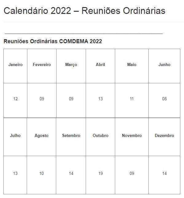 Calendário de Reuniões Ordinárias 2022 23/12/2021 Conselho: Conselho Municipal de Desenvolvimento do Meio Ambiente (COMDEMA) Tipo: Planejamento e cronograma Data do documento: 23/12/2021 Anexo: