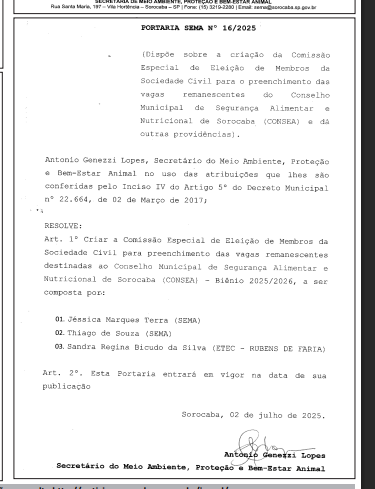04/07/2025 Conselho: Conselho Municipal de Segurança Alimentar e Nutricional de Sorocaba (CONSEA) Tipo: Publicação Numeração: PORTARIA 16/2025 Data do documento: 04/07/2025 Anexo: