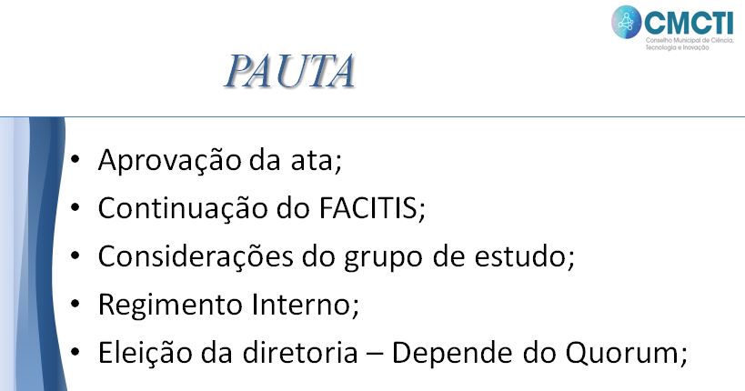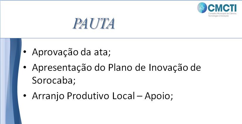 Pauta 6ª reunião ordinária 26/08/2019 Conselho: Conselho Municipal de Ciência, Tecnologia e Inovação (CMCTI) Tipo: Pauta de reunião Numeração: Pauta 6ª reunião ordinária Data do documento: 04/02/2019 Anexo: