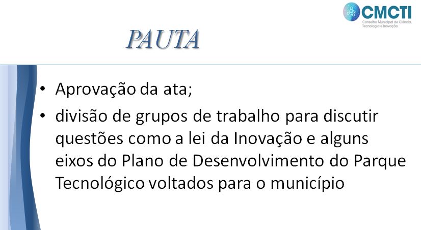 Pauta 7ª reunião ordinária 26/08/2019 Conselho: Conselho Municipal de Ciência, Tecnologia e Inovação (CMCTI) Tipo: Pauta de reunião Numeração: Pauta 7ª reunião ordinária Data do documento: 10/04/2019 Anexo: