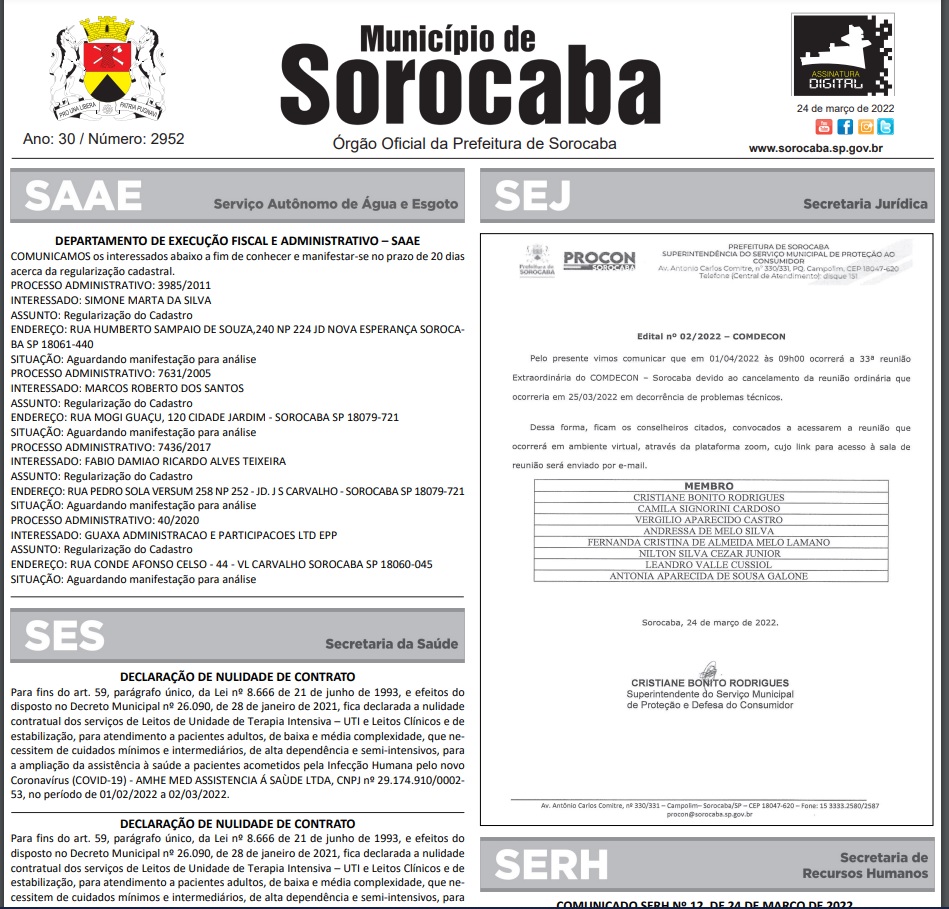 Com relação as publicações no site do COMDECON, de 08 de abril de 2022, página 1, Seção Documentos, Edital nº 02/2022, referente a 33ª Reunião do COMDECON – Conselho Municipal de Proteção e Defesa do Consumidor, informamos que: