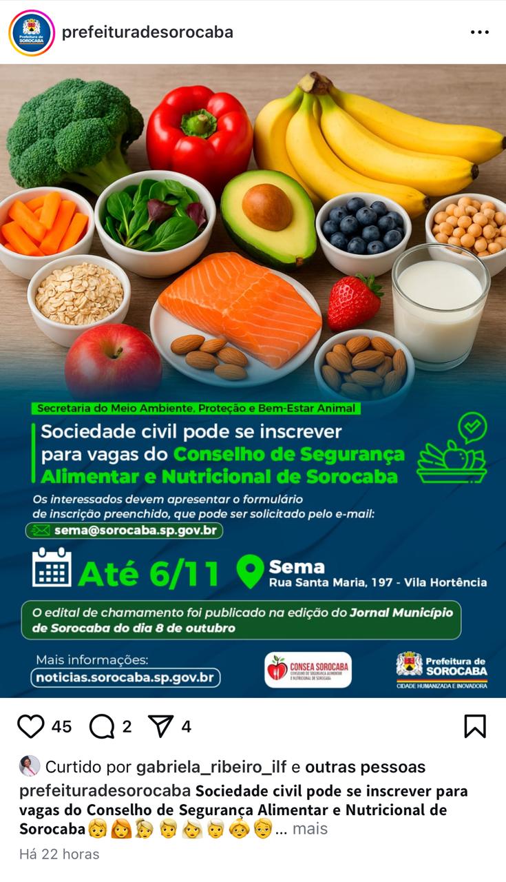 Publicação Prorrogação do Edital de Chamamento 05/2025 – CONSEA 16/10/2025 Conselho: Conselho Municipal de Segurança Alimentar e Nutricional de Sorocaba (CONSEA) Tipo: Publicação Data do documento: 14/10/2025 Anexo: