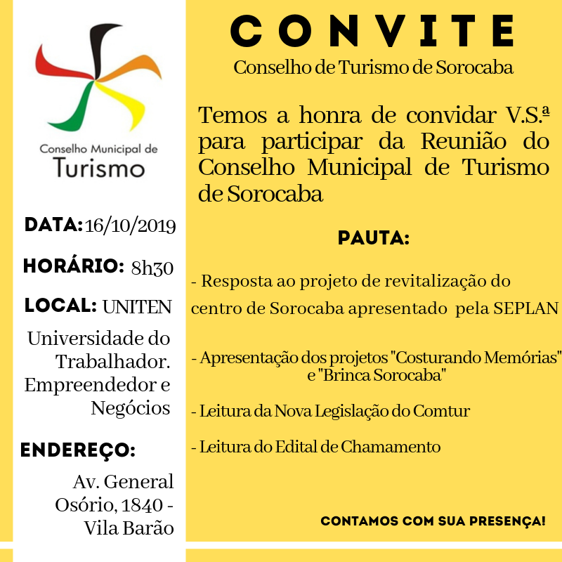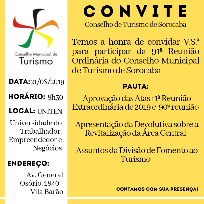 Pauta de Reunião 23/08/2019 Conselho: Conselho Municipal do Turismo (COMTUR) Tipo: Pauta de reunião Numeração: Pauta 91 reunião Data do documento: 14/08/2019 Anexo: