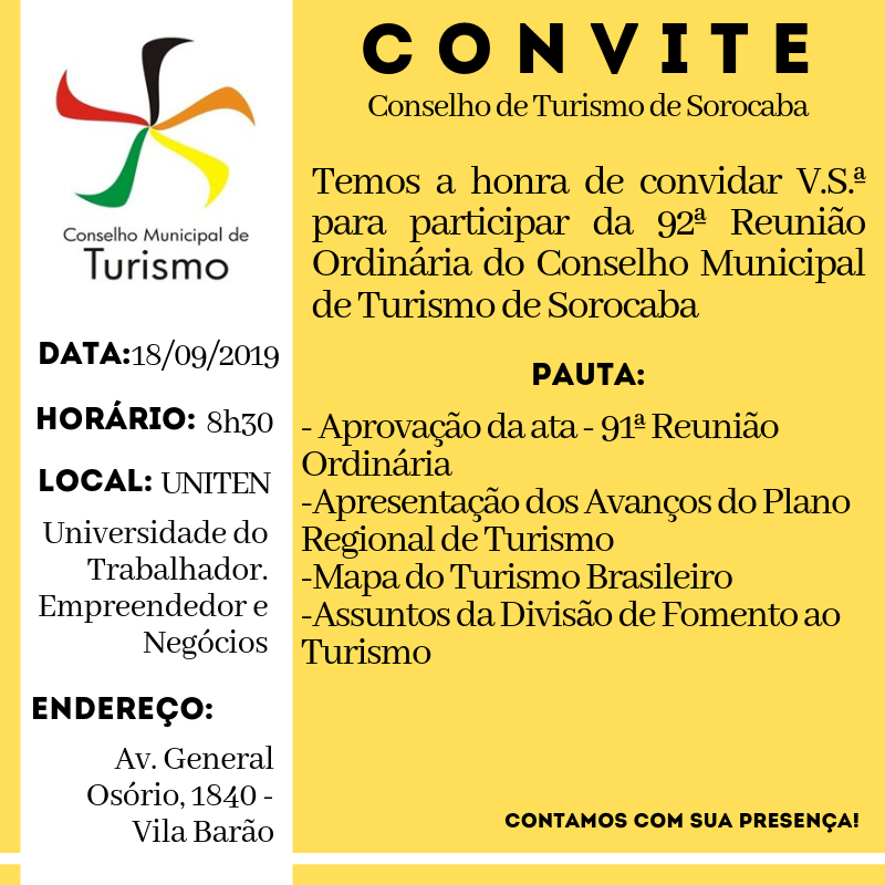 Pauta 92 ª reunião ordinária Comtur 16/09/2019 Conselho: Conselho Municipal do Turismo (COMTUR) Tipo: Pauta de reunião Numeração: Pauta 92 ª reunião ordinária Comtur Data do documento: 14/09/2019 Anexo: